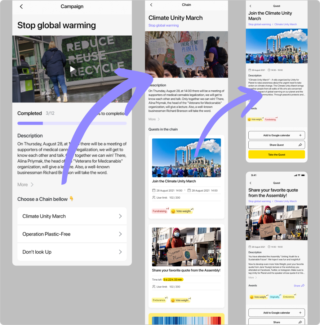 S naší aplikací můžete pomoci své organizaci plněním jednoduchých úkolů, které ji posouvají blíže k dosažení jejích cílů. Za to budete získávat větší vliv na rozhodování hnutí — prostřednictvím bodů Vote Weight, které zvýší váhu vašeho hlasu, a budete rozvíjet osm dovedností potřebných pro každého aktivního člena občanské společnosti.